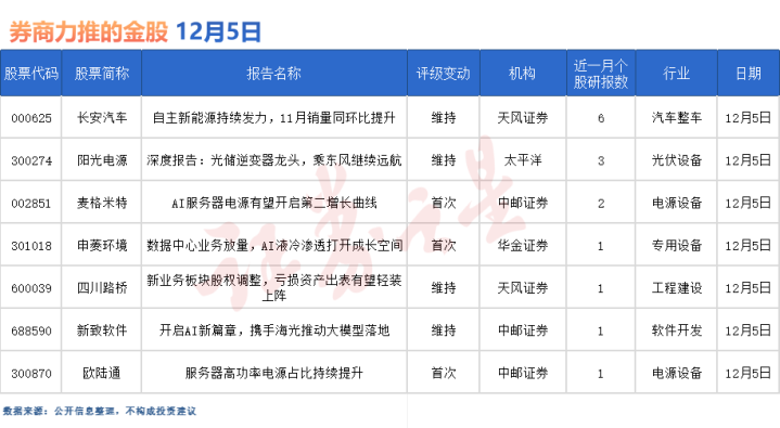 作为光伏逆变器龙头企业,阳光电源也备受券商关注,近一个月获山西证券、太平洋等3份券商研报关注,位居12月5日券商力推股第二。