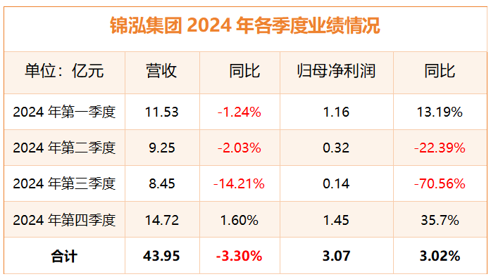 时代周报记者综合业绩快报和三季报数据计算得出,锦泓集团2024年第四季度营收为14.72亿元,同比增长1.60%;归母净利润为1.45亿元,同比增长超35%,一扫此前三个季度的颓势,更是让锦泓集团2024年实现了3.07亿归母净利润。