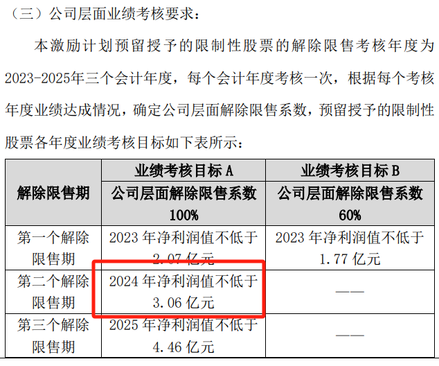 其中,第二个解除限售期所对应的考核目标是“2024年净利润值不低于3.06 亿元”。