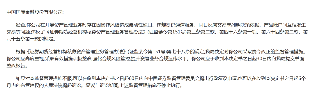 决定显示,经查,中金公司在开展资产管理业务时存在因操作风险造成流动性缺口、违规提供通道服务、同日反向交易未列明决策依据、产品账户间互相发生交易等问题,违反相关规定。