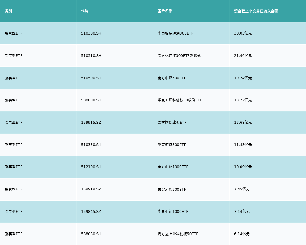 昨日股票型ETF资金流入最多的3支ETF及其流入金额分别为:华泰柏瑞沪深300ETF(流入30.03亿元)、易方达沪深300ETF发起式(流入21.46亿元)、南方中证500ETF(流入19.24亿元)。资金流入前10详情见下表: