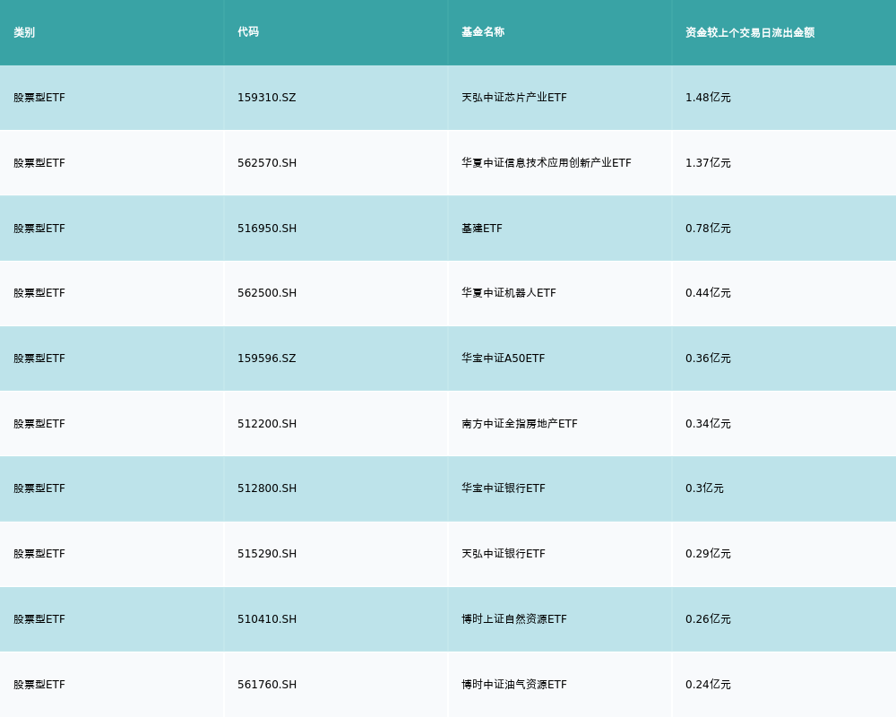 昨日股票型ETF资金流出最多的3支ETF及其流入金额分别为:天弘中证芯片产业ETF(流出1.48亿元)、华夏中证信息技术应用创新产业ETF(流出1.37亿元)、基建ETF(流出0.78亿元)。资金流出前10详情见下表: