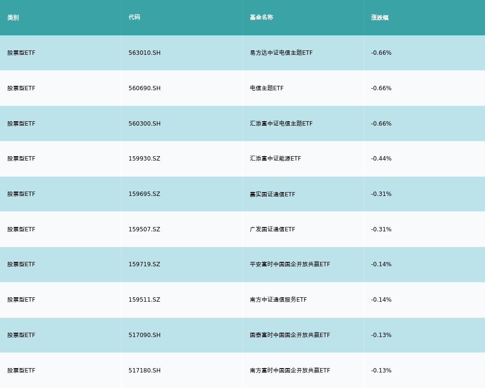 昨日股票型ETF跌幅最大的3支ETF及其收益率分别为:易方达中证电信主题ETF(-0.66%)、电信主题ETF(-0.66%)、汇添富中证电信主题ETF(-0.66%)。跌幅前10详情见下表: