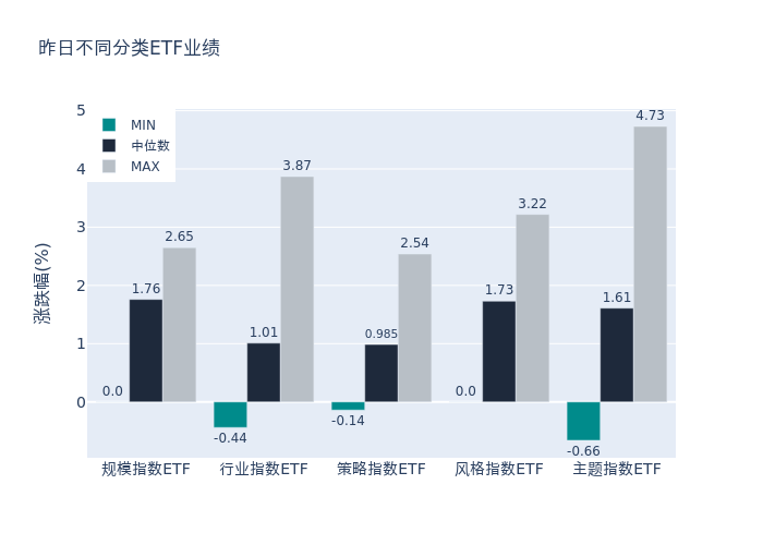 二、ETF市场表现1、股票型ETF整体市场表现昨日股票型ETF收益率中位数为1.64%。其中按照不同分类,规模指数中富国中证沪港深500ETF收益率最高,为2.65%;行业指数中博时龙头家电ETF收益率最高,为3.87%;策略指数中华夏中证红利质量ETF收益率最高,为2.54%;风格指数中嘉实医药健康100ETF收益率最高,为3.22%;主题指数中网购ETF收益率最高,为4.73%。