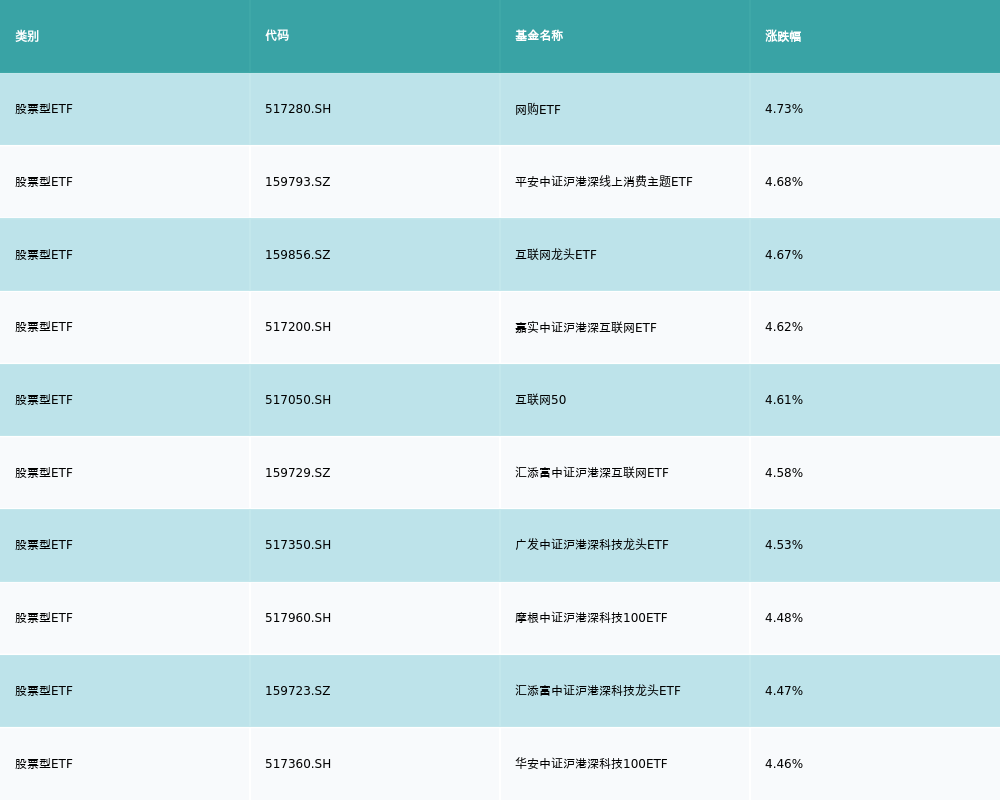 昨日股票型ETF涨幅最高的3支ETF及其收益率分别为:网购ETF(4.73%)、平安中证沪港深线上消费主题ETF(4.68%)、互联网龙头ETF(4.67%)。涨幅前10详情见下表: