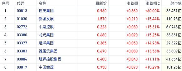 今日世茂集团(00813.HK)收涨60%,地产板块整体开启上涨潮,今日又出现大批个股涨幅超两位数的景象。