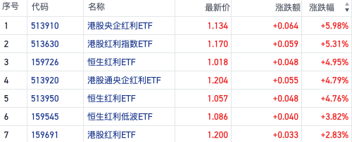截至收盘,包括港股央企红利ETF、港股红利指数ETF、港股通央企红利ETF在内多只红利相关ETF单位份额净值均创上市以来新高。